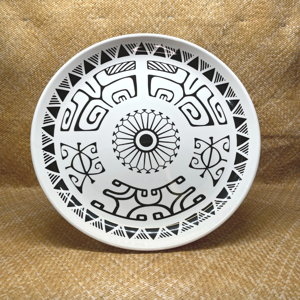 Grand plat chargé de symboles, au centre le clan, la famille, suivi du messager qui communique avec nos ancêtres. Et la frise de tressage autour correspond au Fare, lieu ou on se repose.