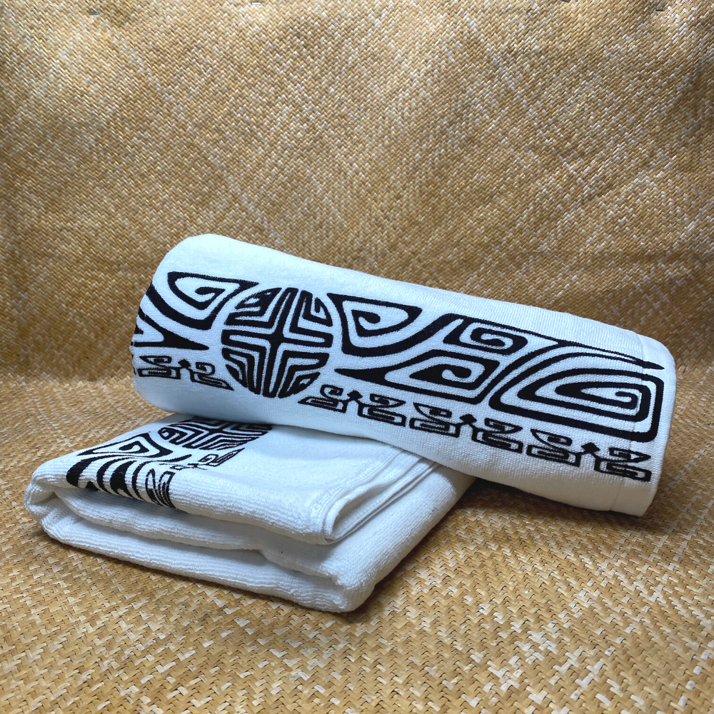 Drap de bain signature de la Tahiti Reception, orné de la frise tattoo Paari sur fond blanc.
