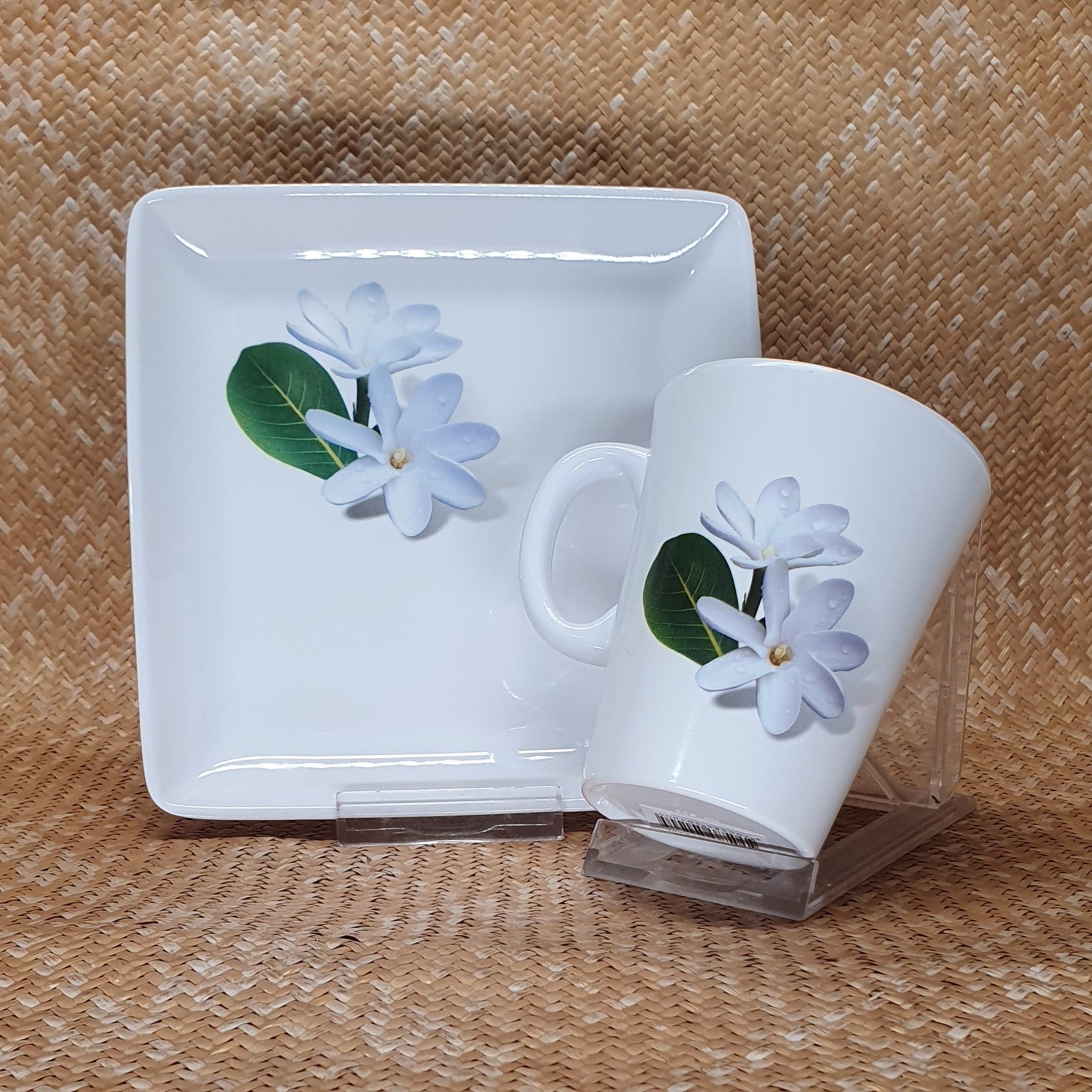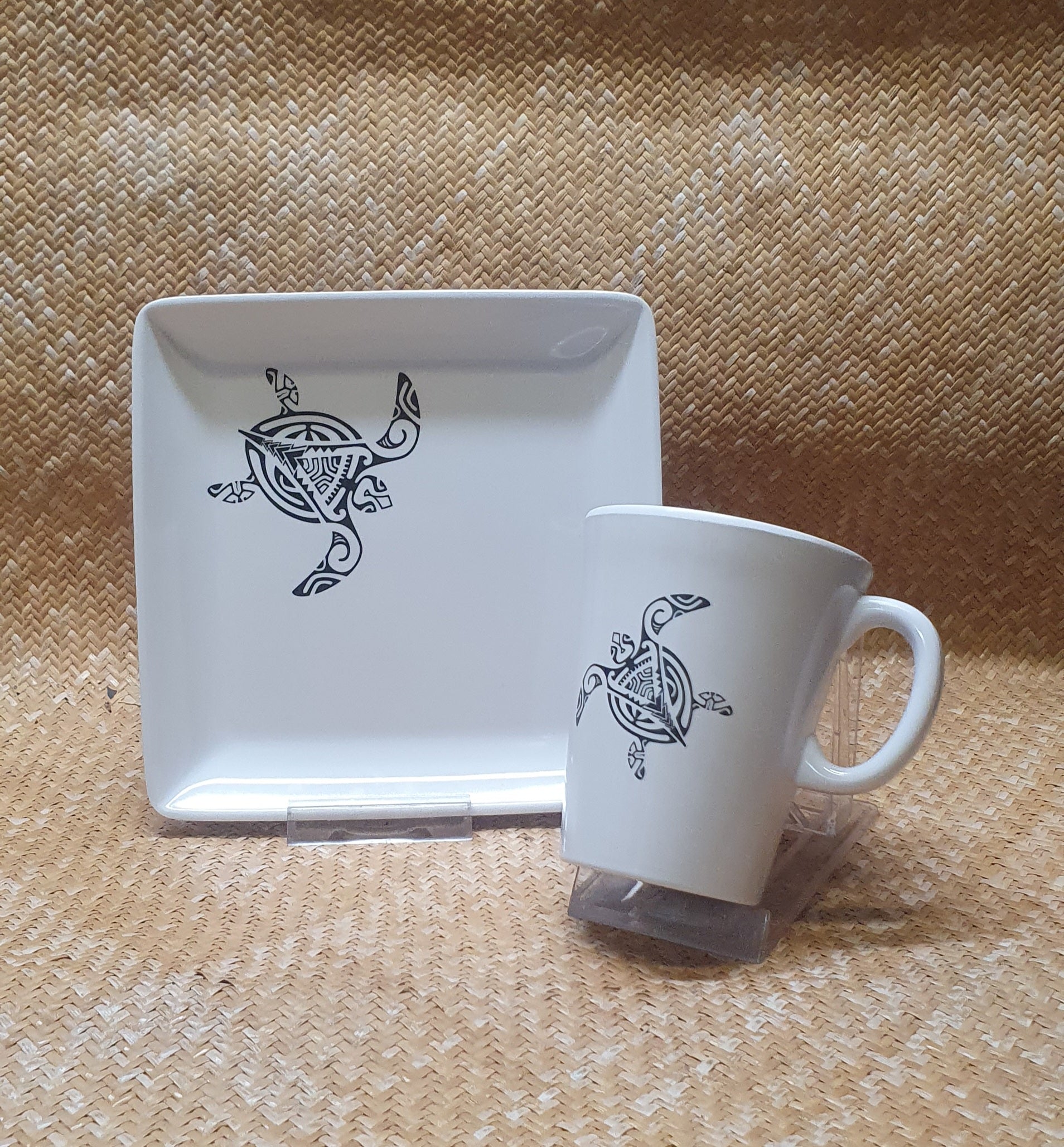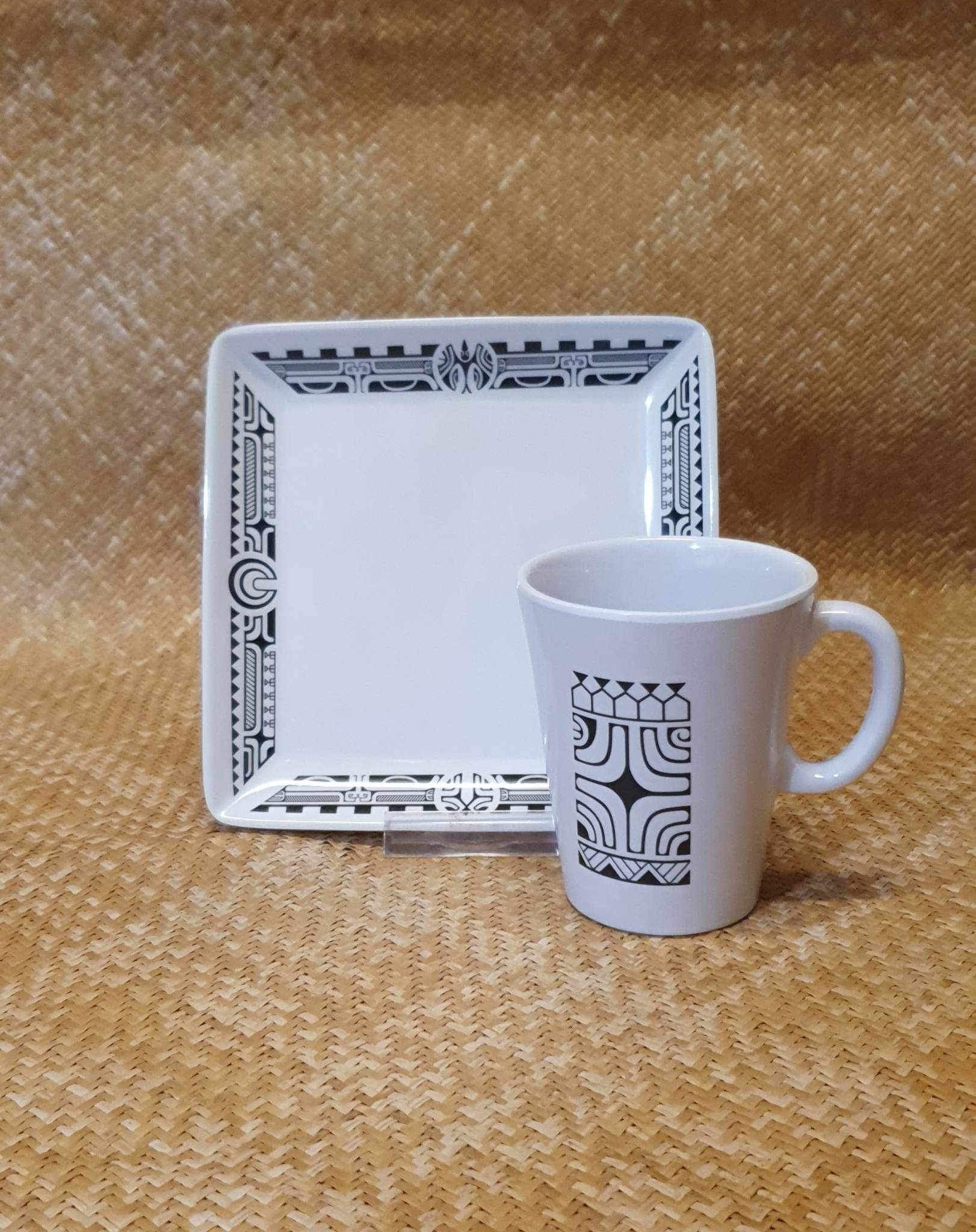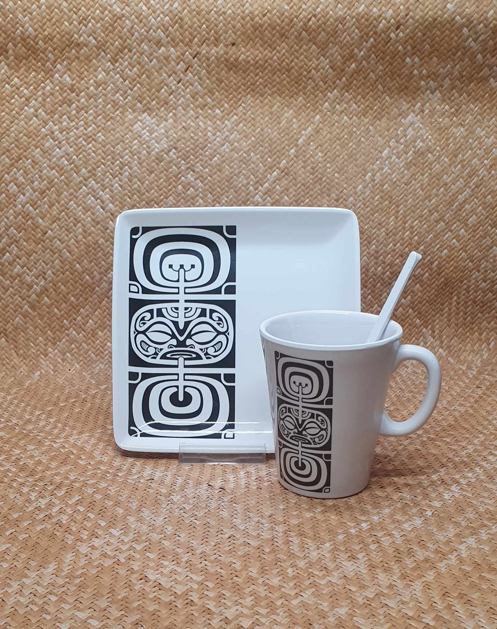 Ce lot contient une mug, une cuillère et une petite assiette. Chacun des éléments est de ce lot est stylisé avec le même motif ou tattoo.