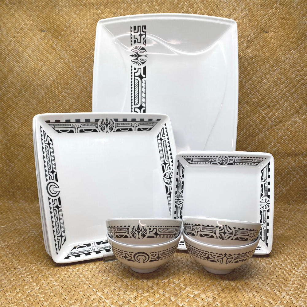 Ce lot contient 4 petits bols, 4 petites assiettes, 4 grandes assiettes et un grand plat rectangulaire. Chacun des éléments est de ce lot est stylisé avec le même motif ou tattoo.