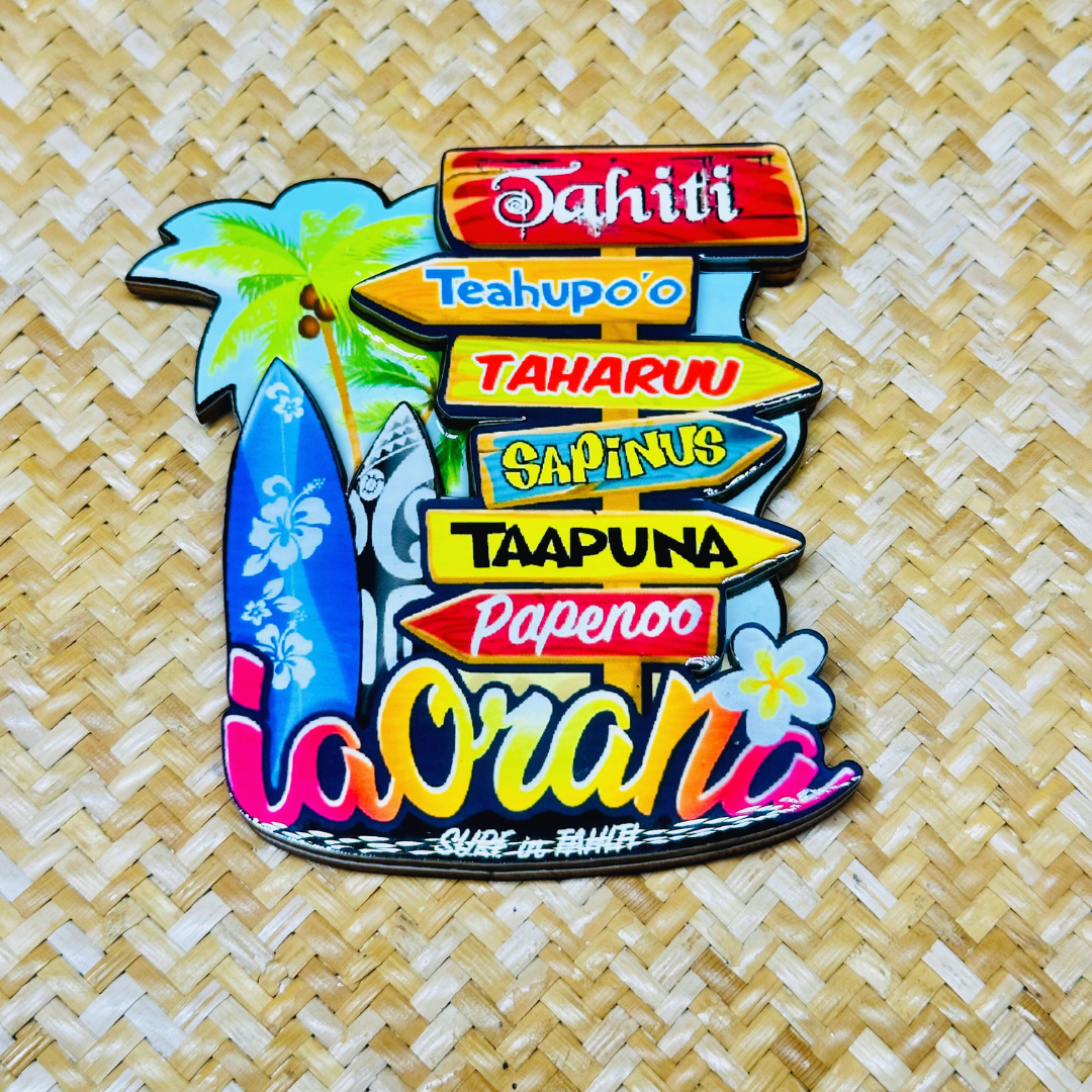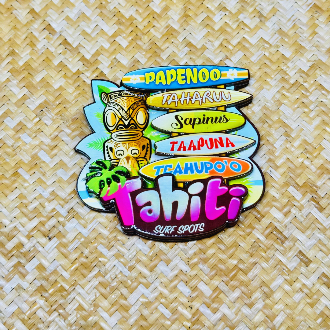 Moorea, Tahiti, Ia ora na, Raiatea... Chacune de ces magnets intègrent les lieux dits et spots de surf les plus en vogues des îles présentes sur chaque design...