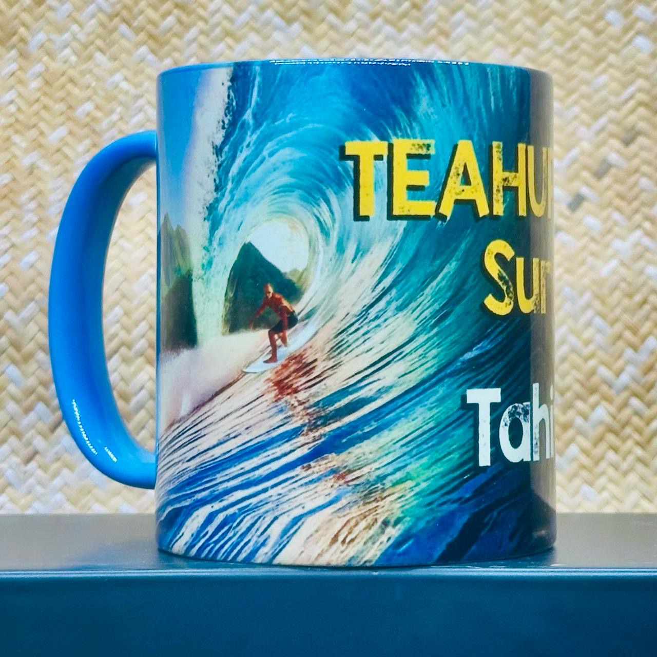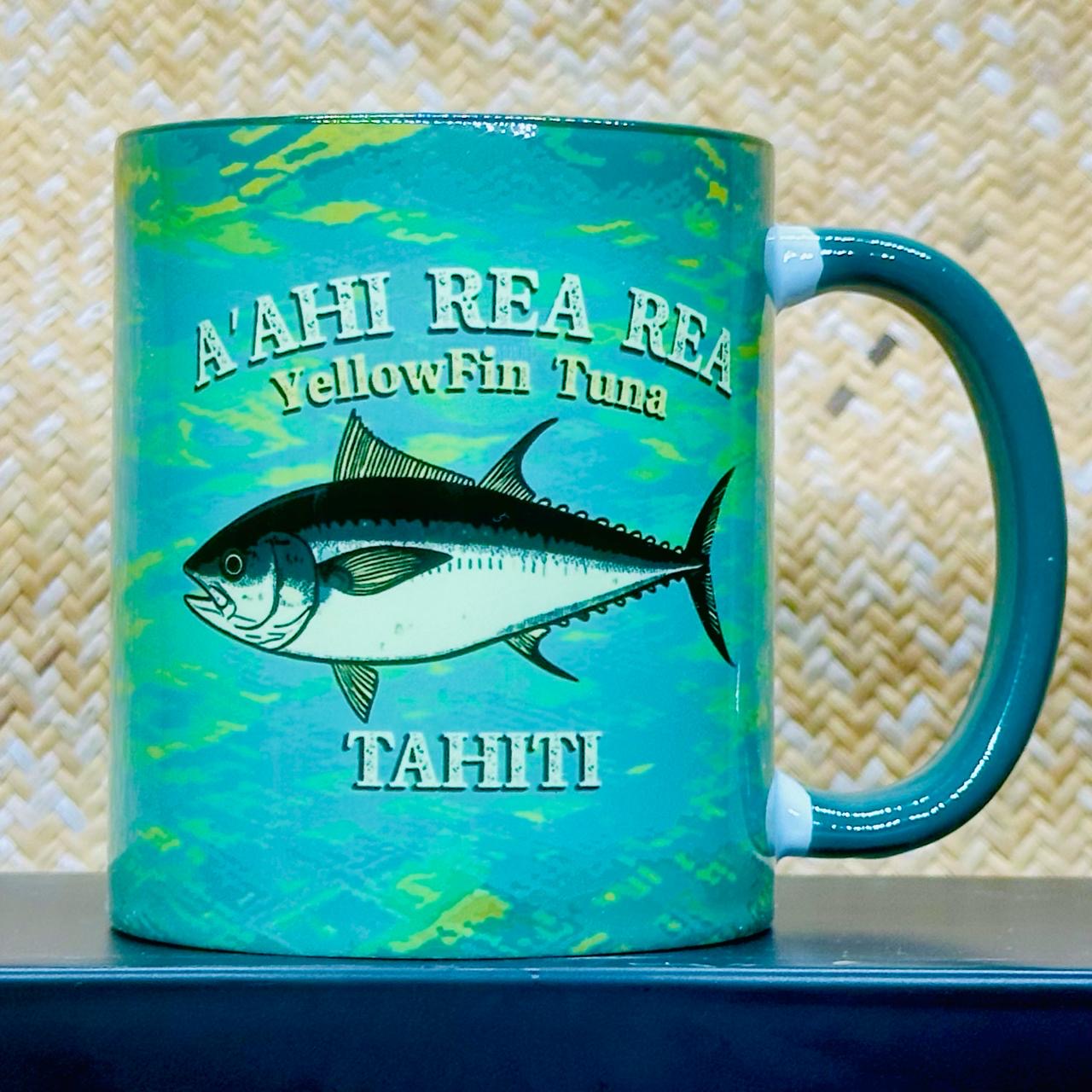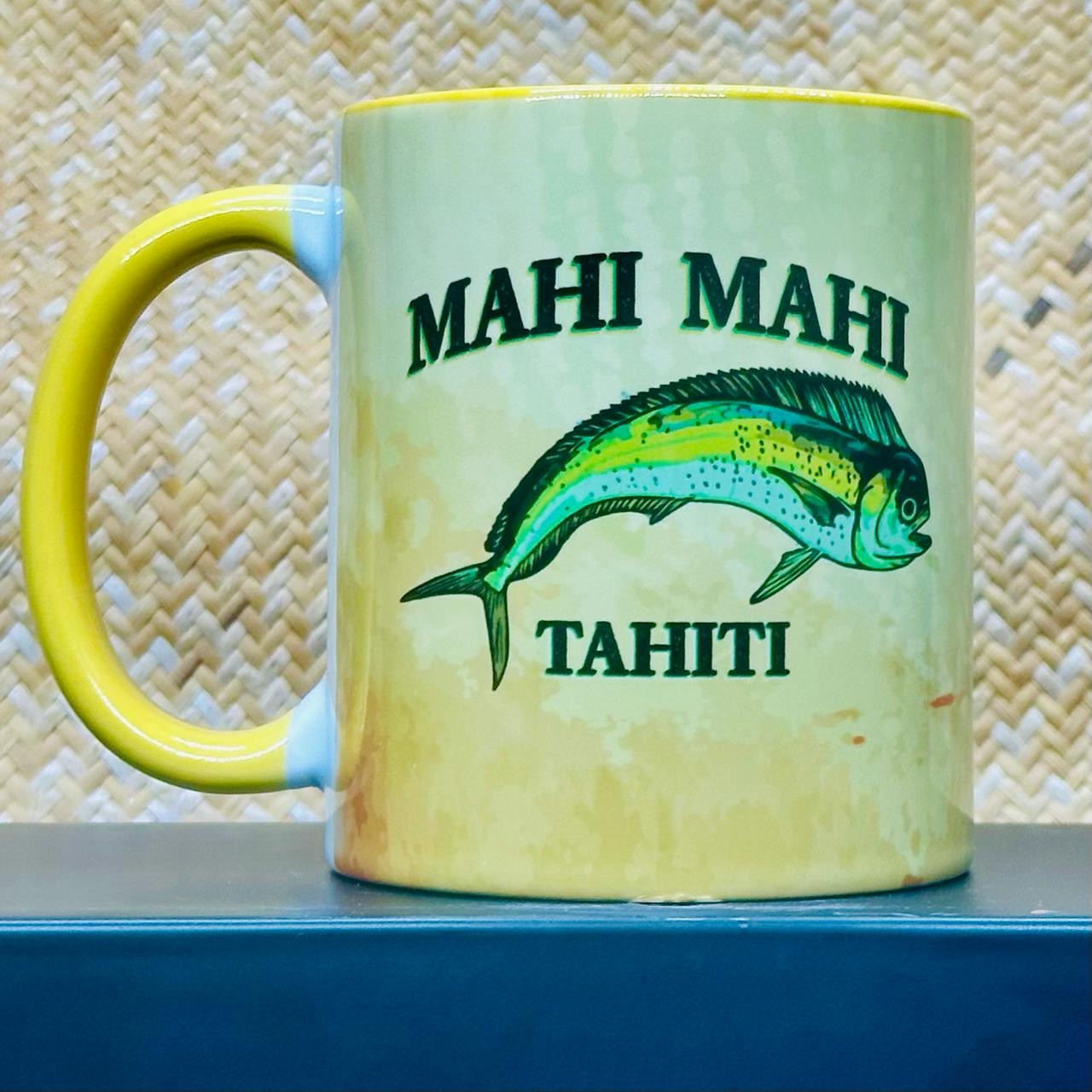 Tahiti, Teahupo'o, Firi firi, Mahi mahi, Yellow fin... Chacune de ces tasses / mugs intègrent des éléments clés de la culture Tahitienne.