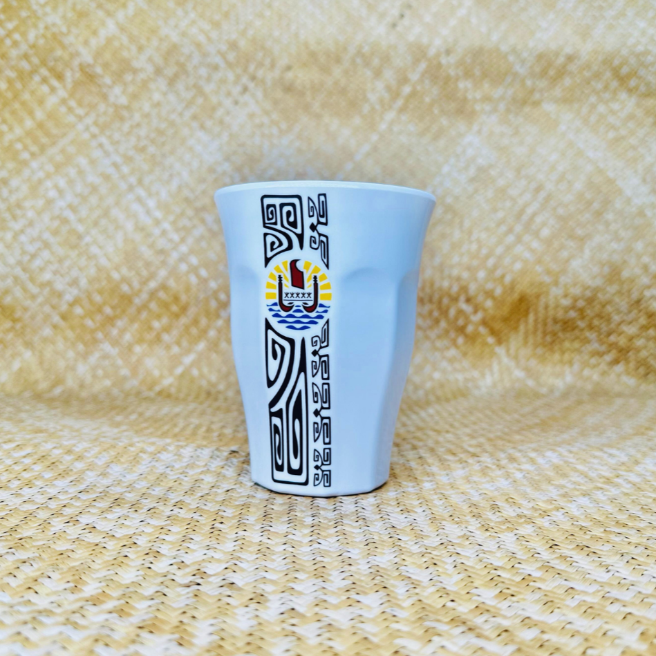 Sur ce verre figure l'emblème de la Polynésie , avec une pirogue double et 5 Tiki correspondant au 5 Archipels, sur la bande figure des (ETUA) personnage important.