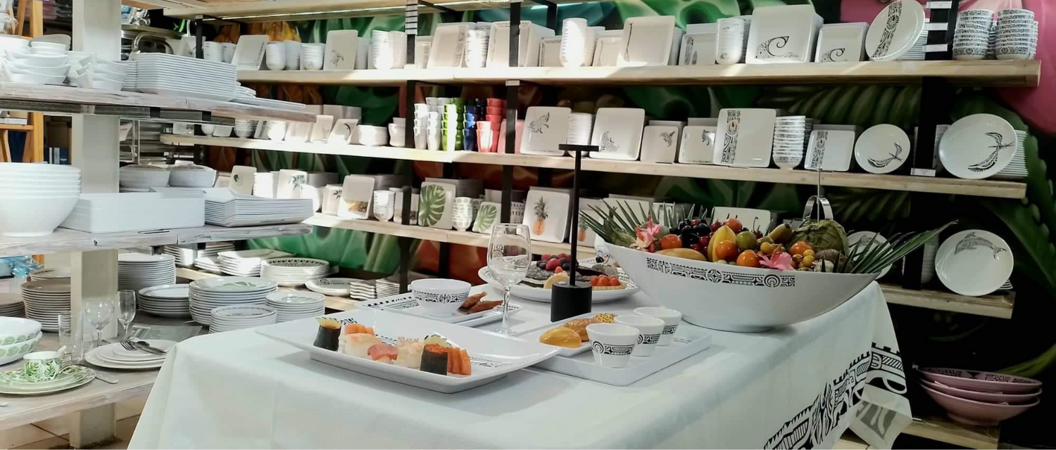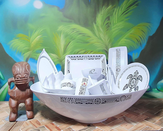 Et décide de créer une vaisselle chargé de notre bagage culturel. Tatouages Marquisiens, Umete, Pahua (bénitiers), Ori Tahiti, Va'a, Artisanat... Il s'inspire de toute l'identité Maohi dans un premier temps, puis du pacifique depuis 2018. Et créer des designs originaux en collaboration avec des artistes locaux.